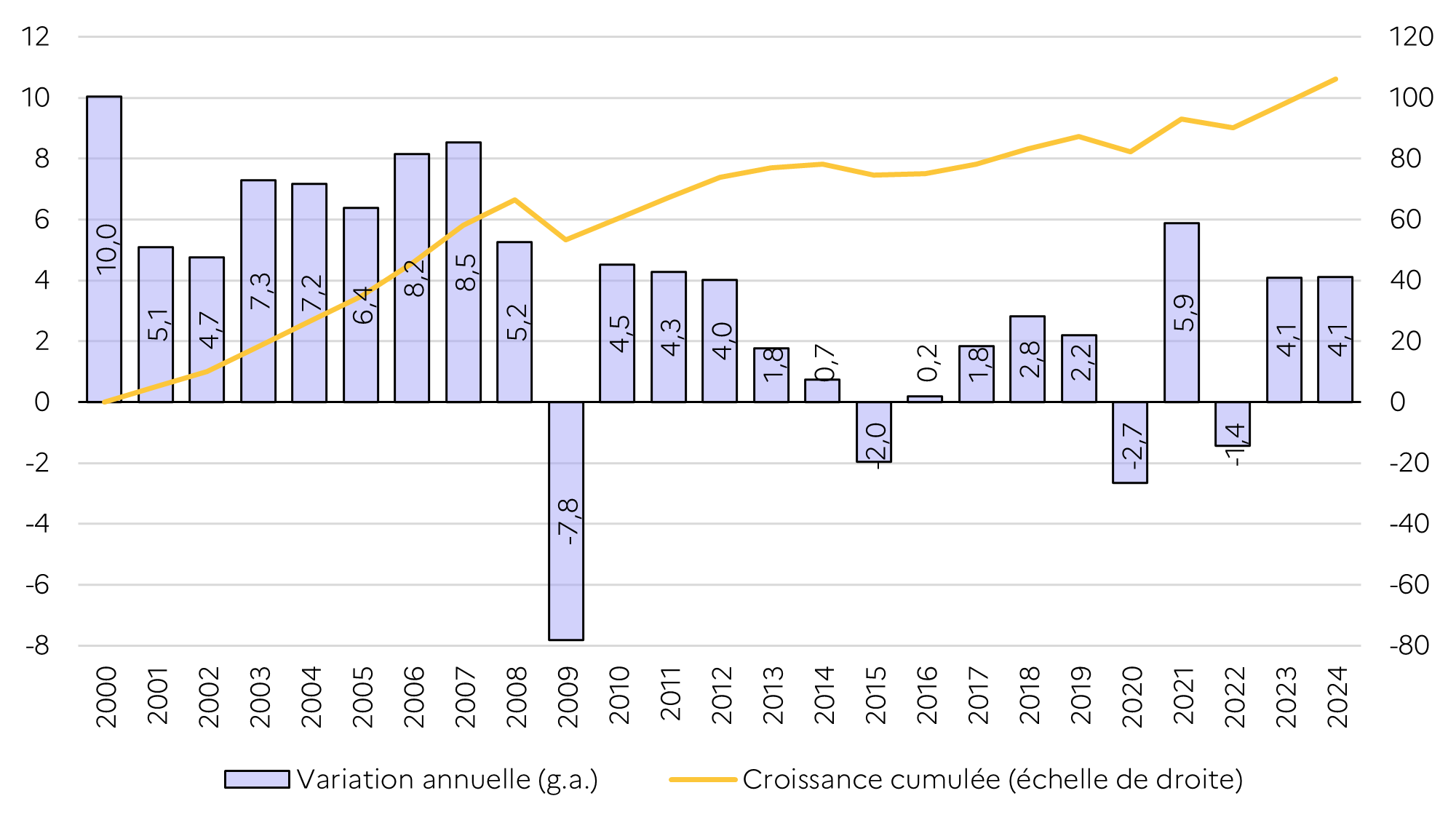 Croissance du PIB russe en % de 2000 à 2024 (source : Direction générale du Trésor, France)