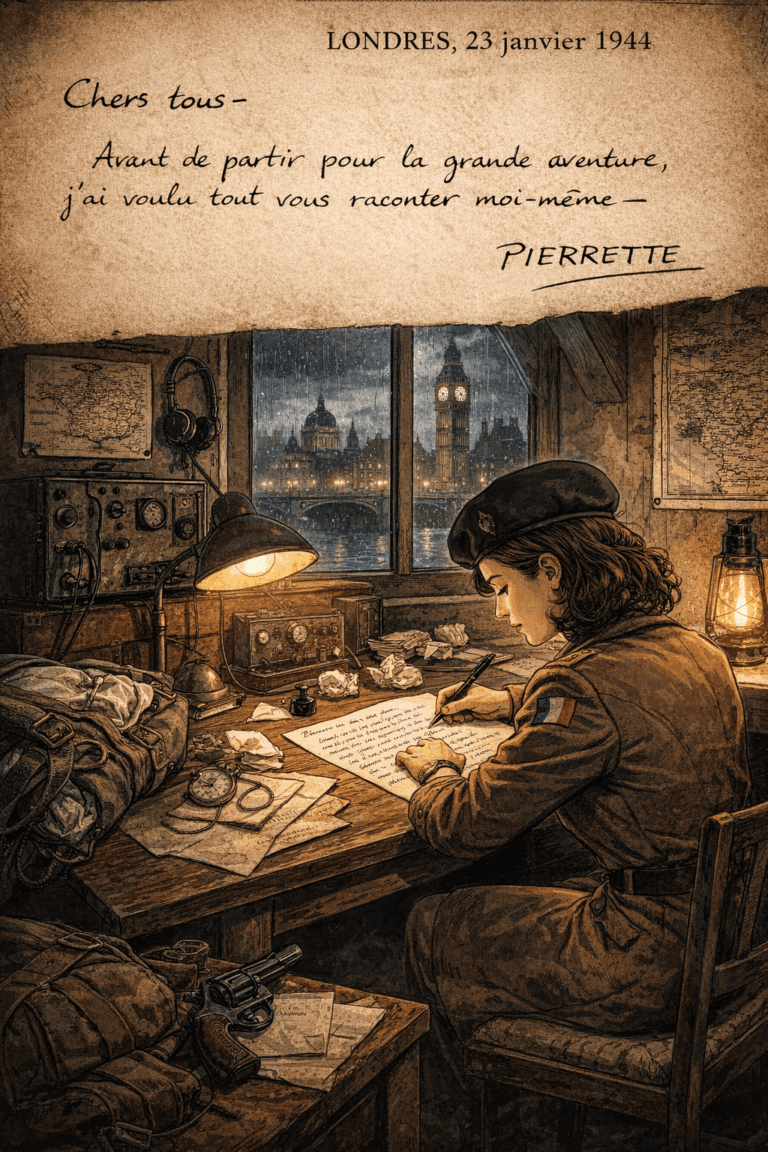 Avant de partir pour la grande aventure j’ai voulu tout vous raconter moi-même — Ce sera peut-être pour vous une consolation, car si vous la lisez c’est que je ne serai plus — Je sais quelle pourra être votre peine mais la seule chose qui pourra non l’amoindrir, mais la rendre moins amère, c’est que ma mort n’aura pas été inutile, c’est qu’elle aura servi à la France — il ne faut pas que vous en soyez trop tristes car cette mort-là c’est la seule que je souhaite avoir, parce que c’est la plus belle — mon âge ne compte pas, l’important c’est que je ne vais pas me battre, comme une unité quelconque dans un troupeau qui se bat parce que “c’est ainsi”, parce que c’est une obligation — je suis volontaire — et cela veut dire beaucoup — c’est autre chose qu’un mot — cela implique avant tout la lucidité, le choix — Cette mission dont je ne reviendrai peut-être pas, je ne l’ai pas subie comme un ordre — je ne l’ai pas non plus acceptée à l’aveuglette — non j’ai pensé et j’ai choisi — c’est mon esprit qui a consenti, et dès lors donner ma vie, n’est plus un sacrifice. Pourtant j’aime la vie — je sens en moi une force, un goût de la lutte qui pourraient me gagner ma vie. Mais je ne pourrais conserver cette force, ni avoir le désir de vivre, si je me dérobais à ce qu’il y a dans mon esprit — cette chose là ce n’est plus le chauvinisme sentimental de mon enfance — c’est quelque chose qui fait partie de moi, c’est l’amour de la France — une passion qui n’est plus “instructive” mais lucide, dépouillée d’attendrissement ridicule — Je ne vais pas me battre pour des mots, pour des idées ou pour des gens — je ne vais pas non plus me battre contre des mots, des idées d’autres gens — mais pour sauver un “tout” qui ne peut pas disparaître — une forme de vie un idéal — c’est la France — je ne sais pas vous expliquer cela — mais je sens la France en moi et c’est pour cela que j’ai choisi de partir, que je n’ai pas voulu être le spectateur impuissant qui se contente de souffrir en mots — que j’ai refusé d’acheter mon existence au prix de mon esprit — Pour cela je me suis engagée — la chance m’a rapidement servi — fin juillet j’ai été une des deux filles à l’occasion de servir a été donnée — La seconde suivante j’avais accepté — je suis donc entrée au 2e bureau — En septembre je suis arrivée à Londres par avion — j’ai complété mon instruction technique par la formation de radio clandestine — Puis j’ai fait l’entraînement de parachutiste — Après un départ raté en novembre, il y a eu les jours d’attente et de fièvre — et à nouveau l’espoir c’est pour dans quelques jours — Ainsi, une nuit, dans la lune qui vient, un avion m’emportera au-dessus de la France — je sauterai en parachute — et accomplirai ma mission — J’aurai de faux papiers et des appareils radio clandestins — ma mission sera d’émettre sur Londres et Alger tous renseignements que les agents et moi-même recueillerons — je n’ignore aucun des dangers que je cours — je sais que j’ai peu de chances de m’en tirer — le moins que je risque c’est la forteresse en Allemagne — Mais est-ce que cela compte puisque j’aurai lutté ? Si je meurs, ce sera la règle du jeu, sans regrets, sans amertume puisque mon âme sera intacte — Si je vis, j’aurai gagné mon droit à la vie, et la joie d’avoir été fidèle à mon idéal — Mais je pense à vous, qui restez — et j’en ai beaucoup de peine — mais je sais que vous comprendrez et m’approuverez — Nous nous retrouverons — Je vous dis adieu, sans tristesse — encore une fois je vous embrasse avec toute ma tendresse —