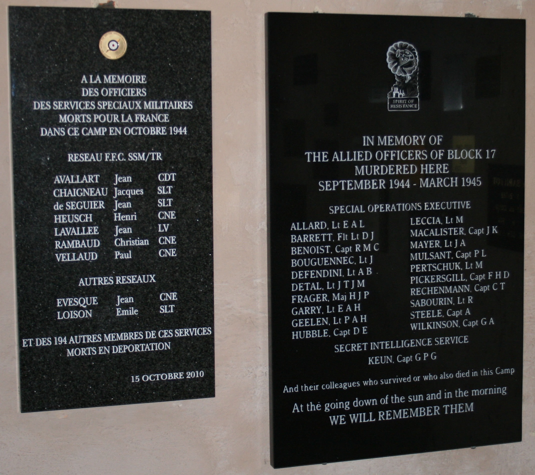 Le 15 octobre 2010, à Buchenwald, ont été apposées dans l’antichambre du four crématoire, conjointement avec nos amis du Special Forces Club britannique, deux plaques à la mémoire des officiers du SOE, du Secret Intelligence Service, des officiers " TR jeune " des Services Spéciaux militaires français et du B.C.R.A., déportés ensemble en août 1944 et exécutés dans ce camp fin septembre - début octobre de la même année. Hommage également à nos 201 Morts pour la France en déportation ainsi qu'à celles et à ceux qui sont revenus de cet enfer en 1945.