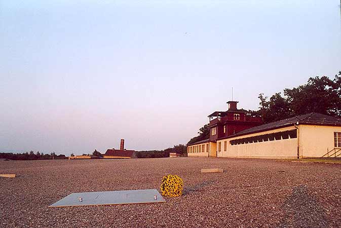 Buchenwald, la place d'appel. Au 1er plan, la plaque des 50 Nations, au 2e plan, l'unique entrée du camp, au 3e plan, le crématoire. |